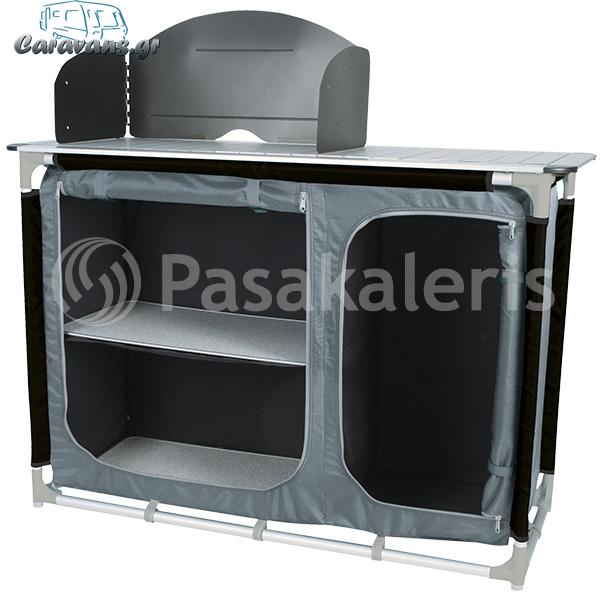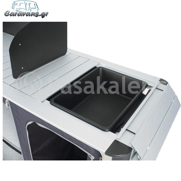 Ένα πρακτικό και λειτουργικό κουζινάκι που συνδυάζει, θέση για την εστία μαγειρέματος, αποθηκευτικό χώρο για κατσαρόλες ή για τρόφιμα, νεροχύτη, θέση για την φιάλη υγραερίου και πολλές πρακτικές θέσεις για μικροαντικείμενα.